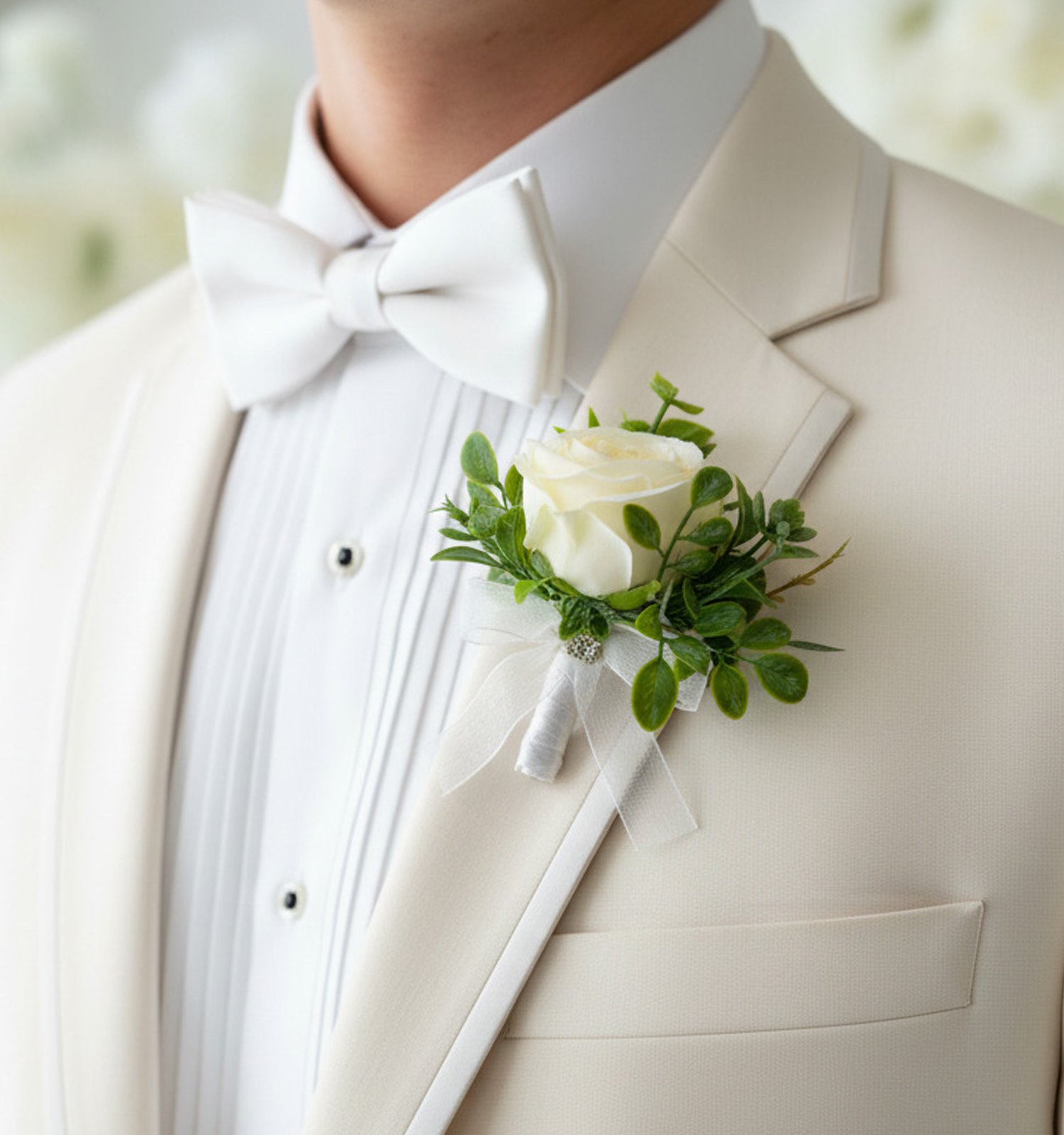 - Elegancka butonierka ślubna w kolorze ecru to subtelny, romantyczny dodatek dla pana młodego, który podkreśla wyjątkowy charakter ceremonii i dodaje stylizacji klasy oraz ponadczasowej elegancji.