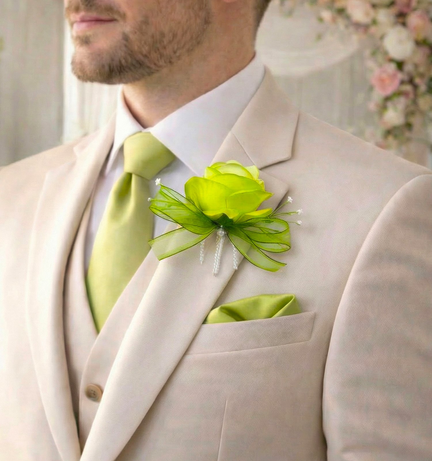 - Butonierka ślubna z limonkową różą i efektowną zieloną kokardą to ręcznie wykonana, wyrazista kompozycja dodająca stylizacji świeżości i nowoczesnej elegancji, starannie zapakowana w pudełko.