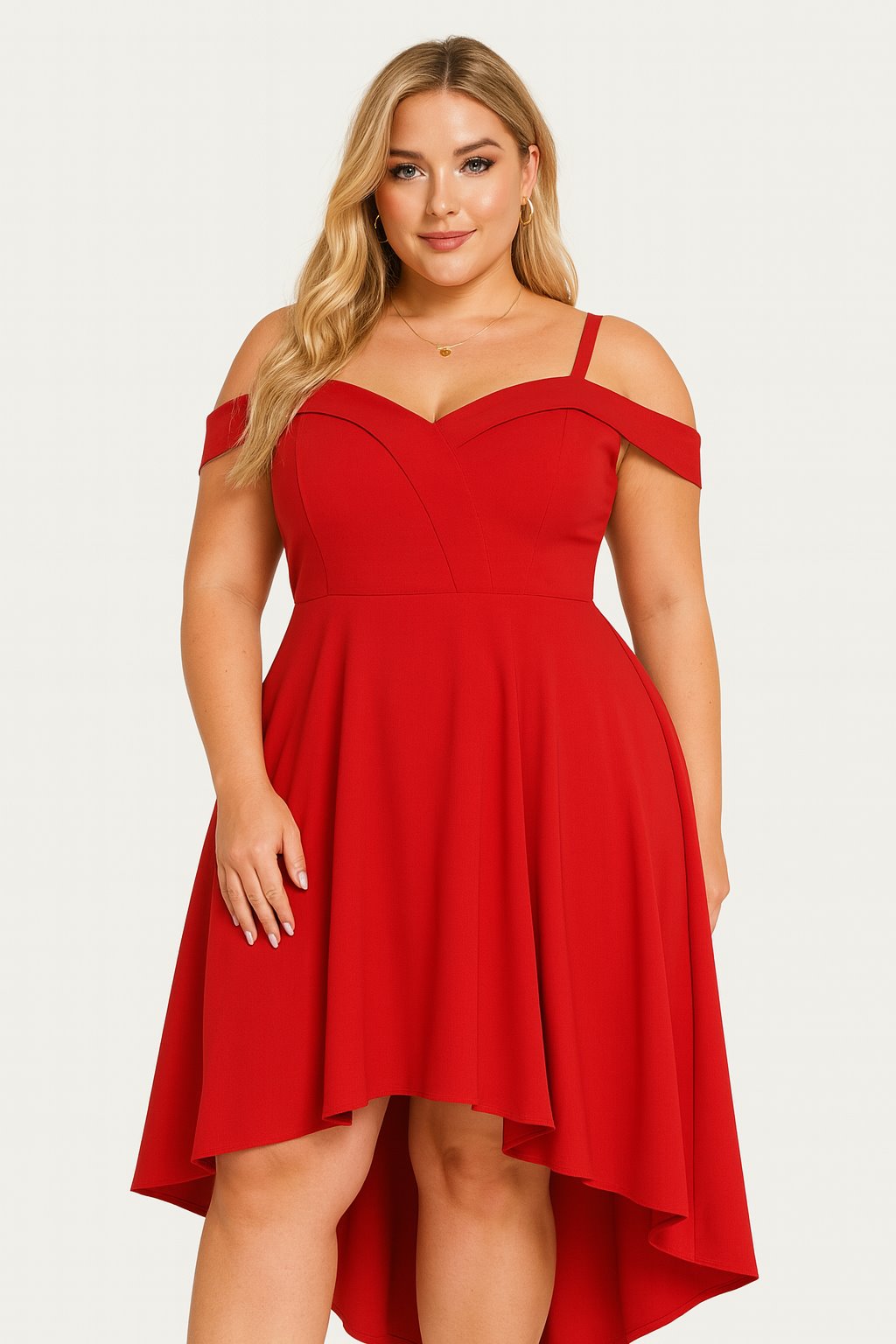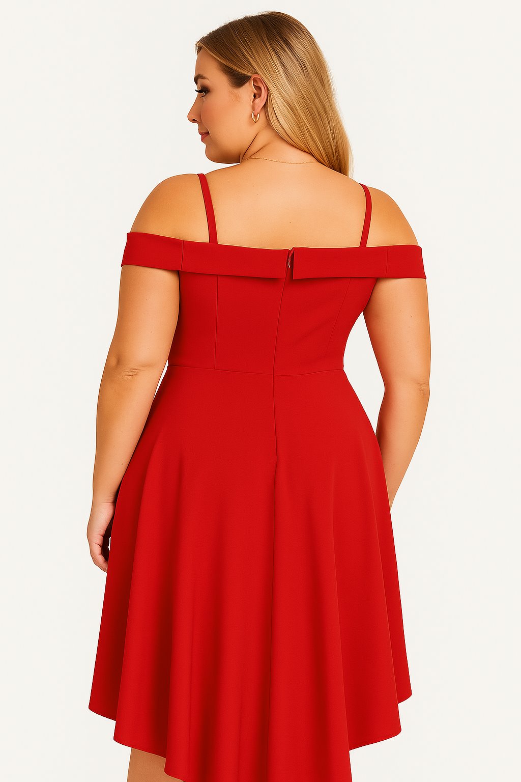 Ta czerwona sukienka plus size o asymetrycznej linii pięknie eksponuje nogi z przodu i wysmukla sylwetkę z tyłu. Dekolt V i wąskie ramiączka subtelnie akcentują górę, a sprężysty materiał zapewnia swobodę ruchów. To znakomita propozycja na wesele, kiedy chcesz połączyć lekkość, kobiecość i wygodę — bez rezygnacji z efektownego, tanecznego looku.