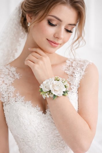 - Delikatny korsarz ślubny z białych róż ozdobionych perłami to elegancki dodatek, który podkreśli romantyczny charakter stylizacji i doda wyjątkowego blasku w tym najważniejszym dniu.