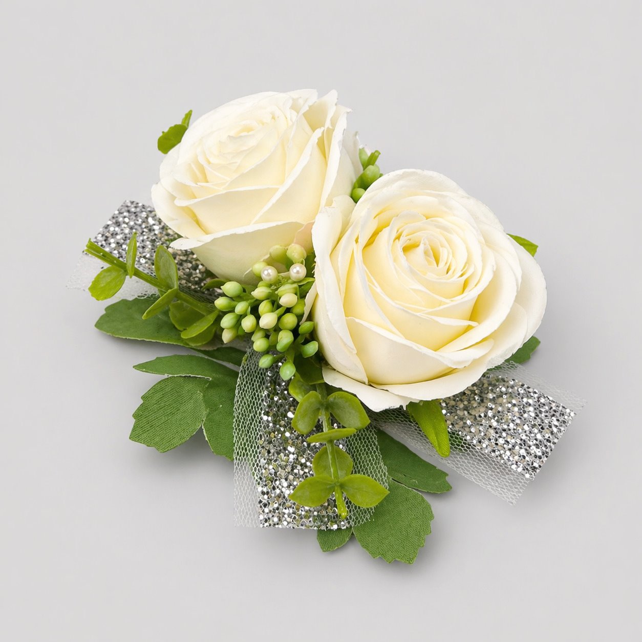 - Korsarz ślubny „Ivory Glam” to elegancka, ręcznie wykonana ozdoba na nadgarstek z ivory róż i świeżej zieleni, która podkreśla romantyczny charakter stylizacji panny młodej i dodaje jej subtelnej, luksusowej lekkości w dniu ślubu.