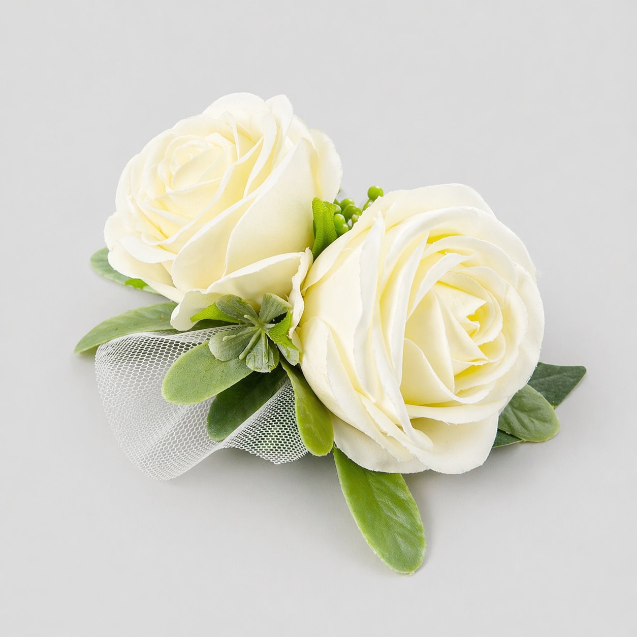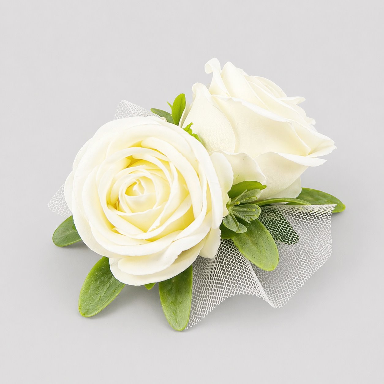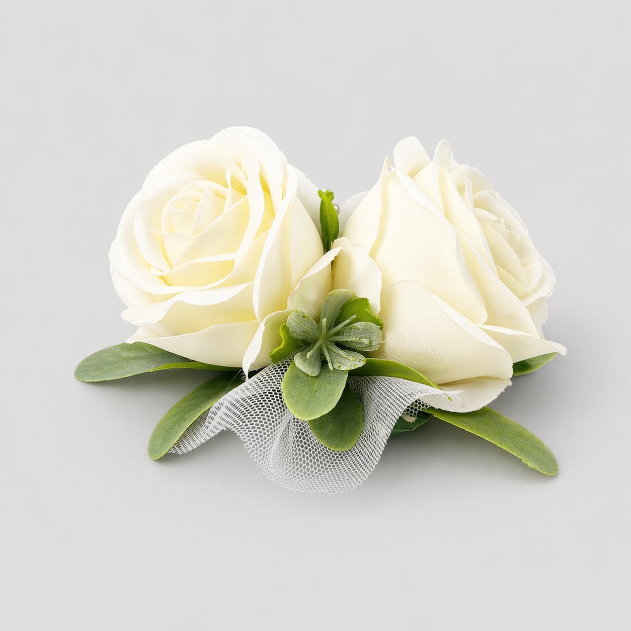 - Elegancki korsarz ślubny na rękę z róż ivory i delikatnego tiulu to subtelna, romantyczna ozdoba dla panny młodej, która podkreśla wyjątkowy charakter ceremonii i dodaje stylowej lekkości każdej stylizacji ślubnej.