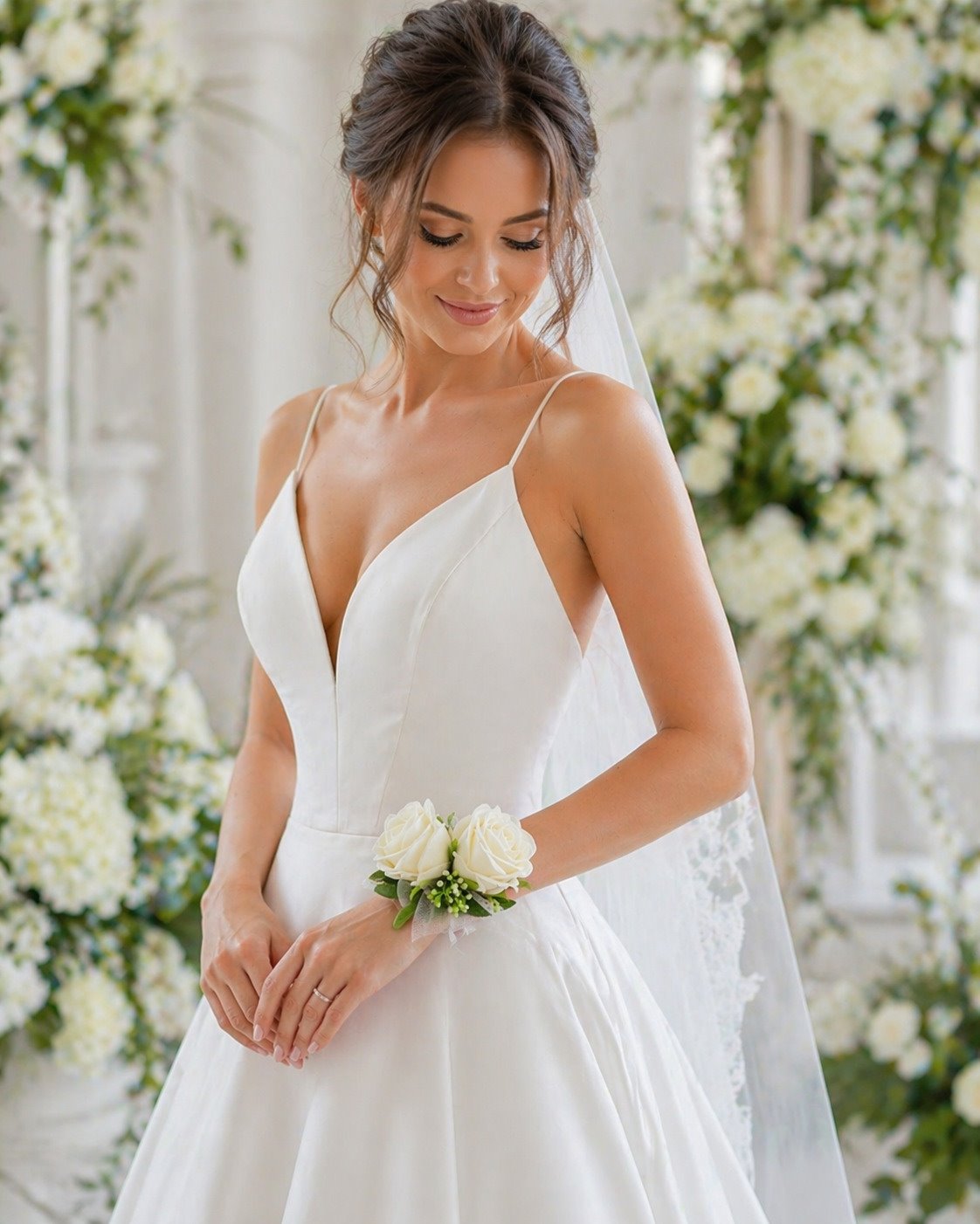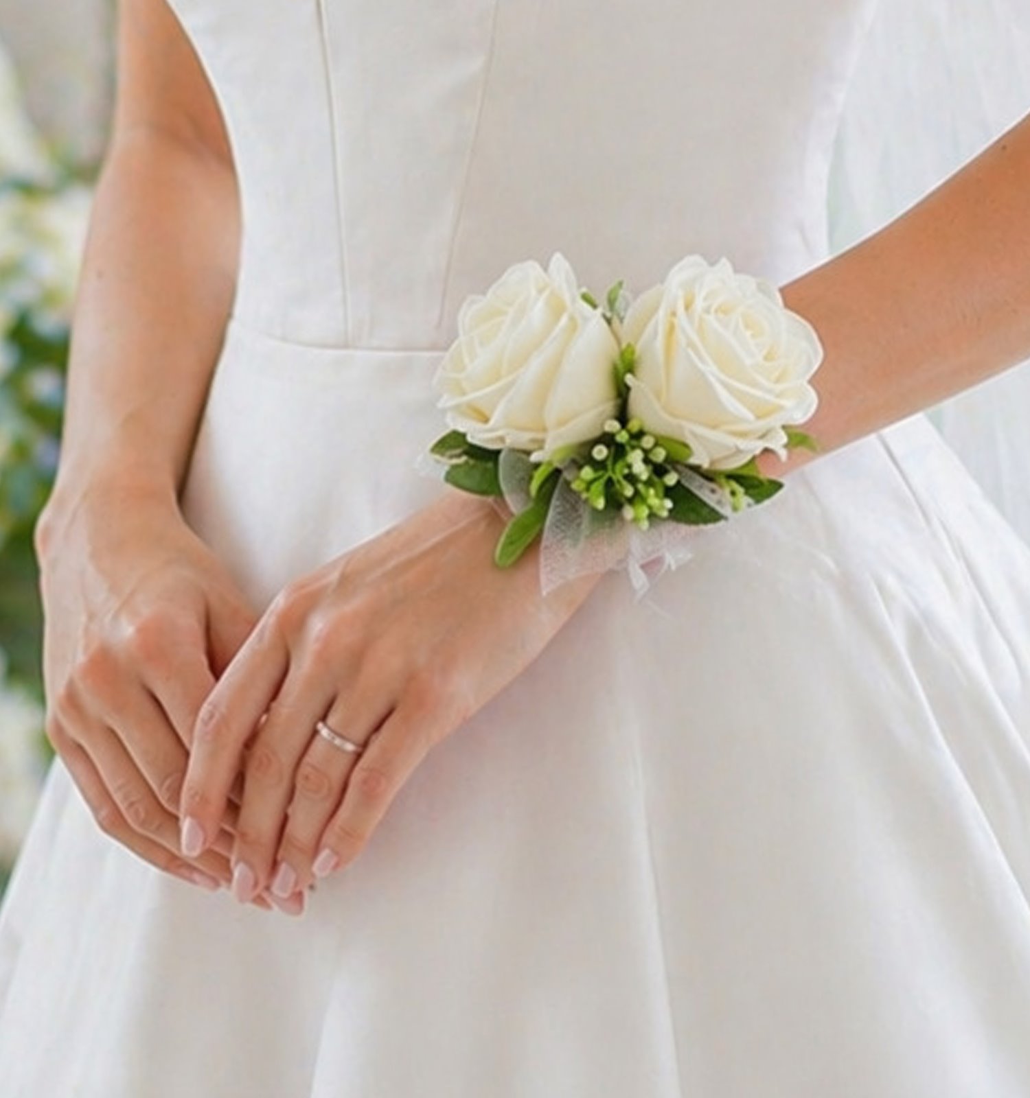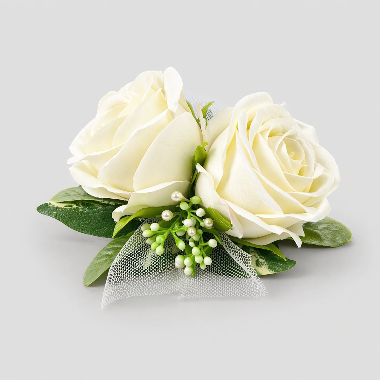 - Elegancki korsarz ślubny na rękę z róż ivory i delikatnego tiulu to subtelna, romantyczna ozdoba dla panny młodej, która podkreśla wyjątkowy charakter ceremonii i dodaje stylowej lekkości każdej stylizacji ślubnej.
