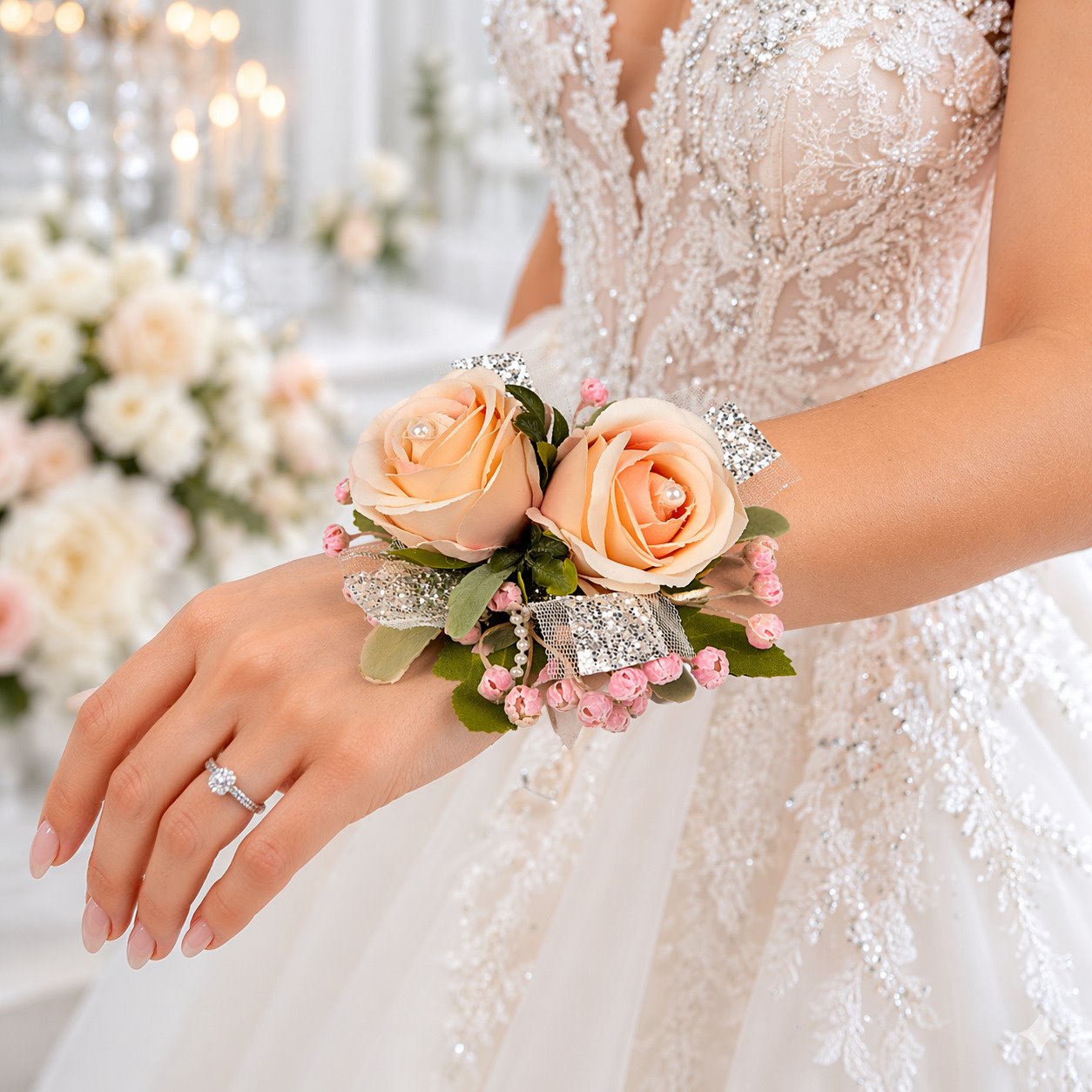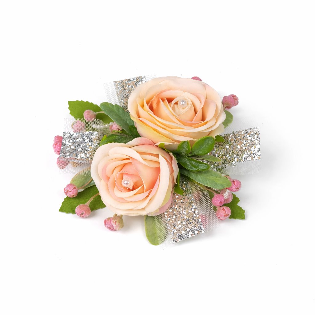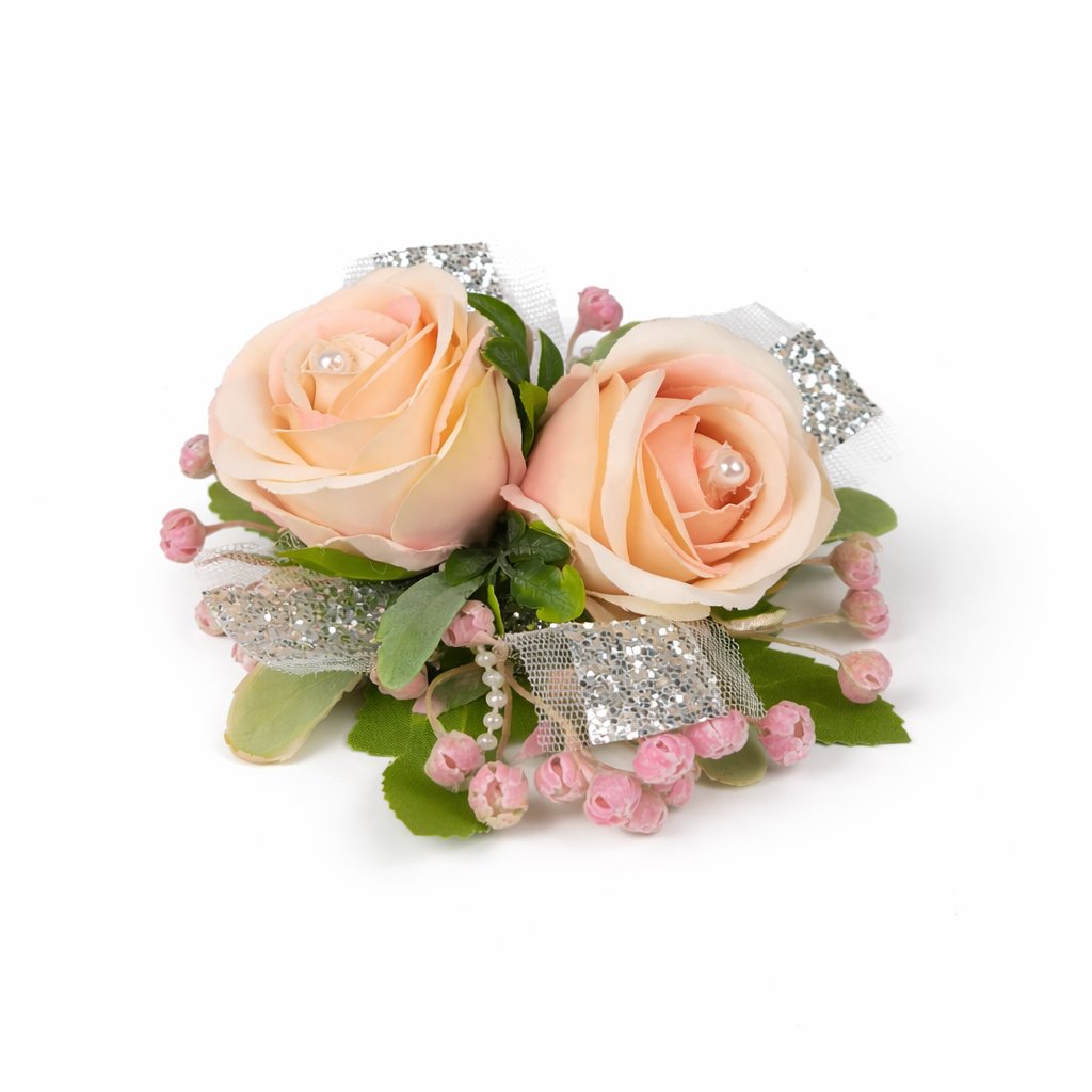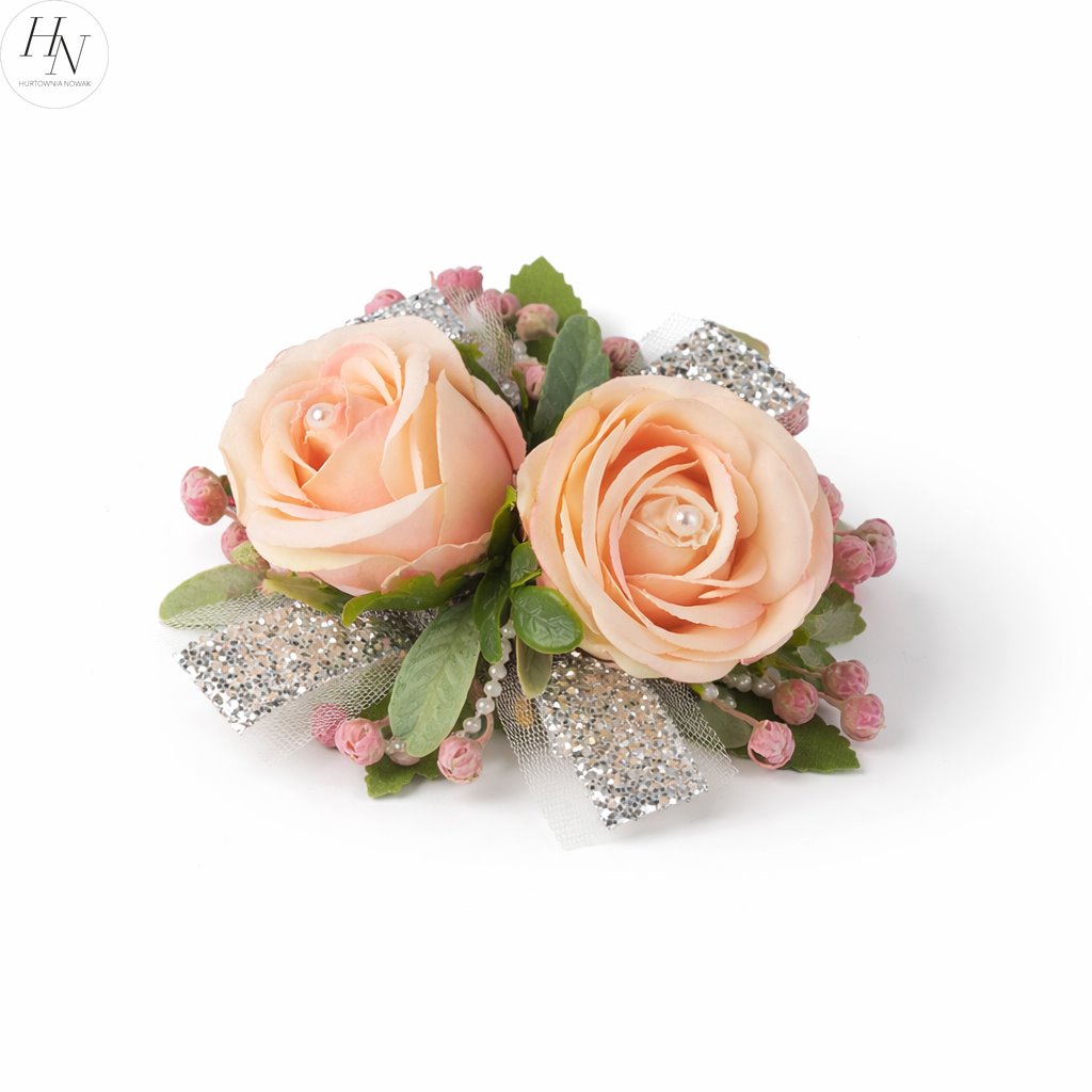 - Elegancki ręcznie robiony korsarz ślubny z brzoskwiniowych róż z perełkami – subtelna, romantyczna ozdoba, która podkreśli wyjątkowy charakter każdej uroczystości.