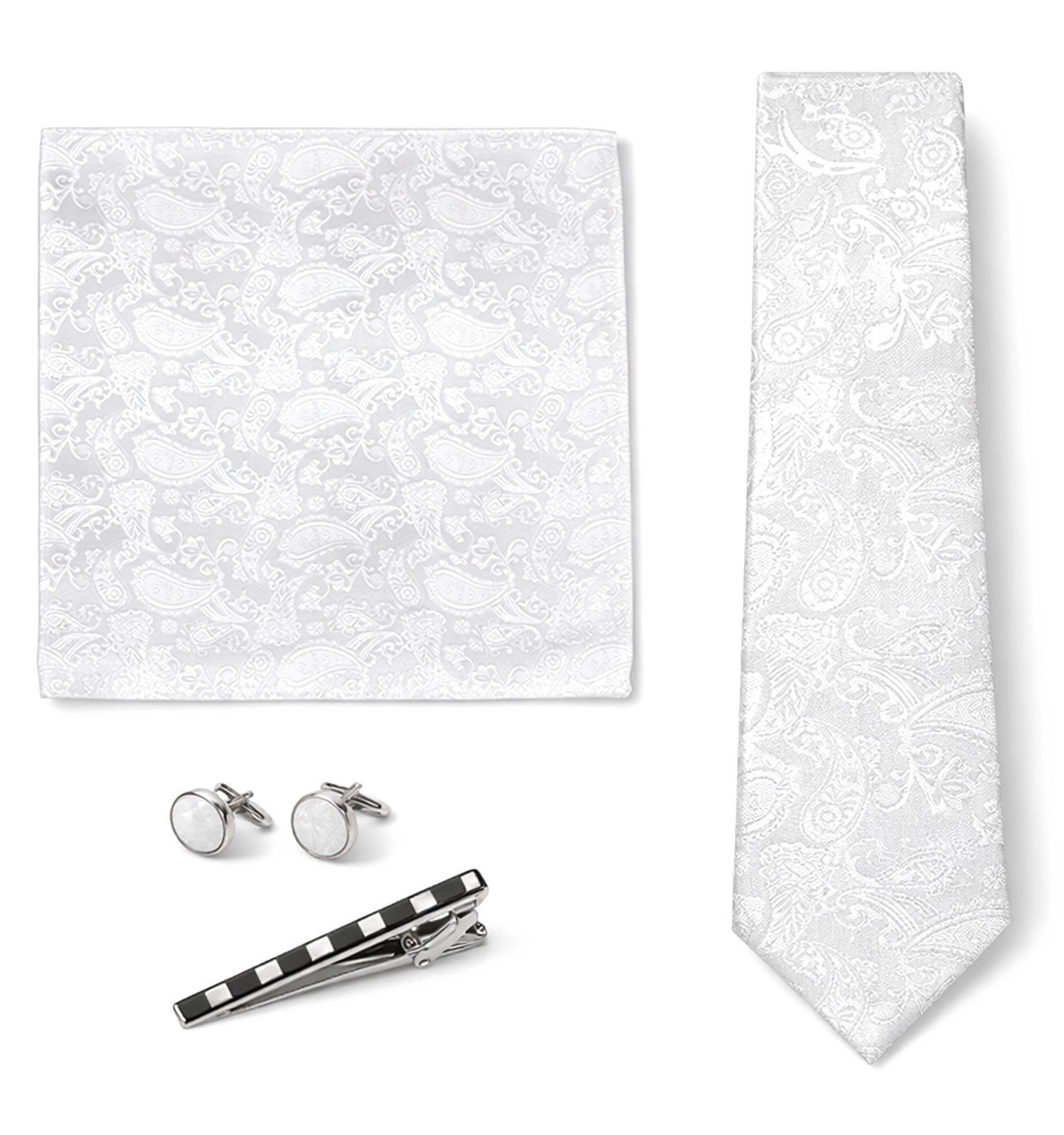 - Elegancki zestaw ślubny z białym krawatem paisley, poszetką i spinkami to ponadczasowy wybór dla Pana Młodego i gości, który podkreśli klasę stylizacji i doda wyjątkowego charakteru każdej uroczystości.