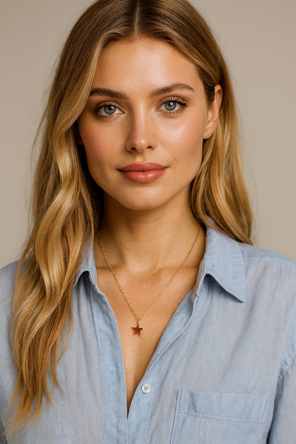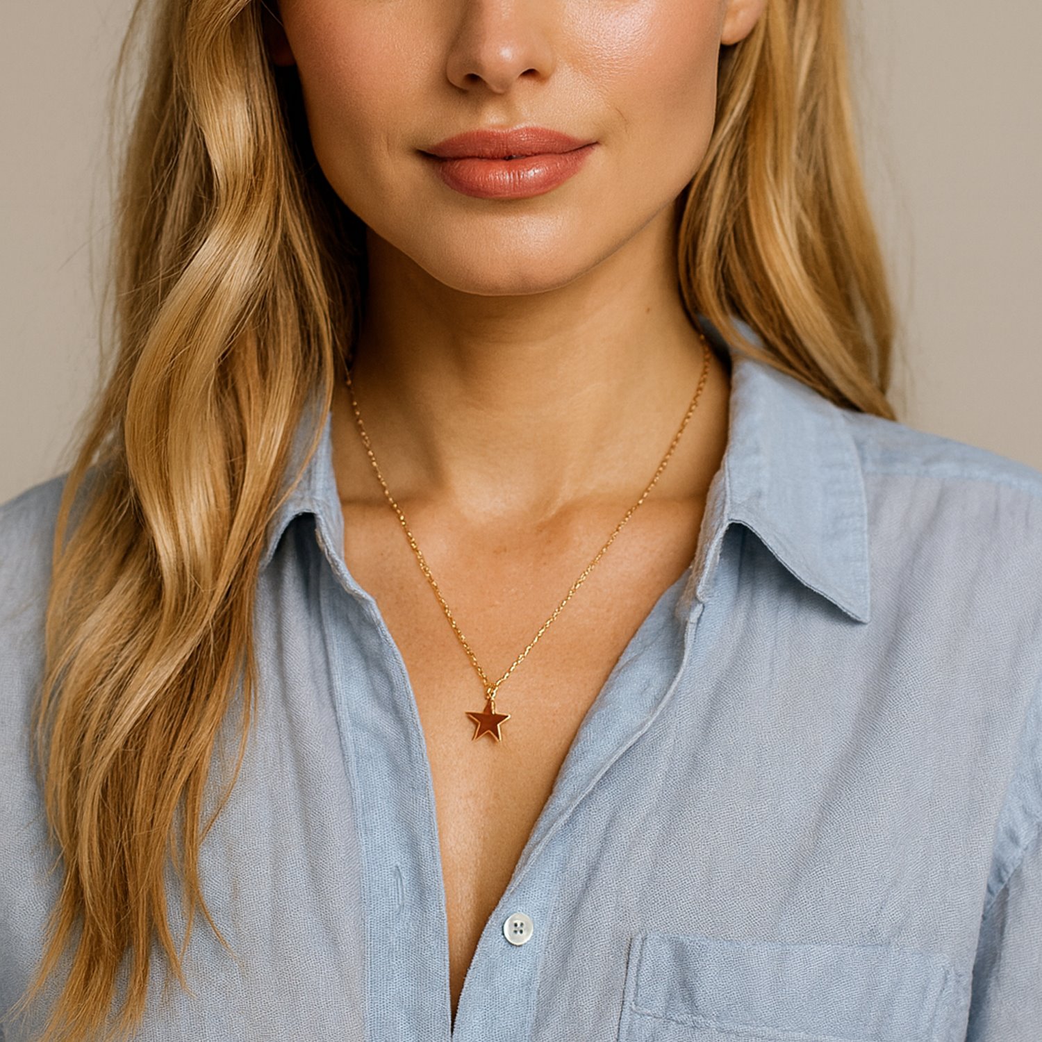 Minimalistyczny naszyjnik z pełną gwiazdką w złotym kolorze to must-have każdej miłośniczki delikatnej biżuterii. Cienki łańcuszek ze stali nierdzewnej pięknie eksponuje błyszczącą zawieszkę, która subtelnie przyciąga wzrok swoją prostotą.