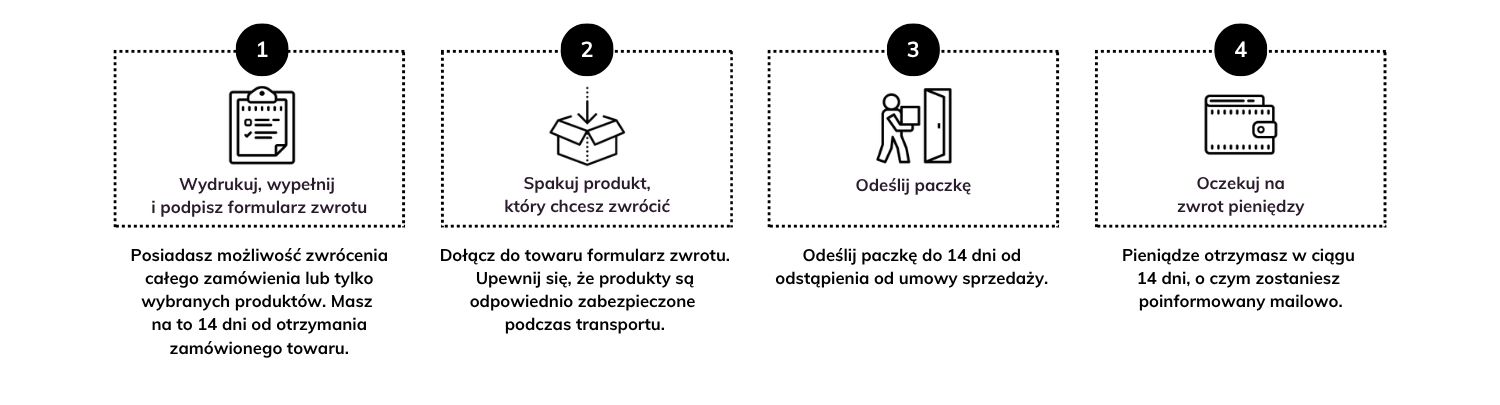 Jeśli zakupiony produkt nie spełnia Twoich oczekiwań, masz możliwość łatwego dokonania zwrotu bez podania jakiejkolwiek przyczyny.